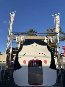 In addition to the paper umbrella decorations, Wakoe Shrine features a unique design - the 'Laughing Torii.' This torii gate is modeled after the traditional deity 'Okame Fukujin,' characterized by a wide, laughing mouth. Visitors pass through her mouth, symbolizing the swallowing of misfortune and the welcoming of happiness. Such torii gates are rare in Japan, inviting visitors to pause and appreciate its unique humor and cultural significance.