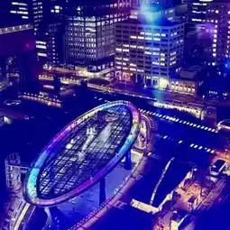 Under the transparent glass roof of Oasis 21's "Water Spaceship," a pool reflects colorful lights, creating a futuristic urban experience. The underground Galaxy Plaza also offers a variety of shops (including a drugstore ๐) and restaurants, perfect for both shopping and relaxing!