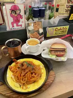 We ordered the Teppan Napolitan and Kinako Ogura Toast. The prices were reasonable as a set menu, and the cafe's charming atmosphere made it a highly satisfying kissaten experience!