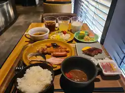 Breakfast is served in a small area that accommodates about 30 people. It tends to be crowded between 7:30 and 8:30 AM, but I had breakfast at 6:30 AM. Unlimited servings of grilled eel and miso katsu are available, along with a good selection of sweets.