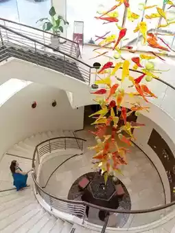 A cute lobby with a spiral staircase and orange ornaments 🍊🤍