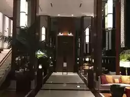 The hotel lobby exudes elegance, with its high ceilings, marble floors, and warm lighting. The space is further enhanced by green plants, modern decor, and comfortable sofas with cushions, creating a relaxing ambiance.