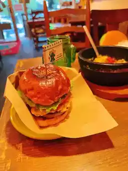 As you step inside, you're greeted by a 100% American-style decor that hits just the right vibe 👍🏻. The staff are super friendly and welcoming. Opening the menu, we were almost overwhelmed by the more than ten burger options, but thankfully, reason prevailed. We ordered a Goya Burger and a serving of Okinawa's signature taco rice!