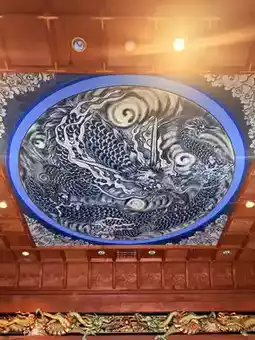 On the third floor, in front of the main hall, there is a statue of Daruma Daishi. The temple staff say that touching the statue can bring blessings for exam success or good health. The solemn main hall enshrines the Bodhisattva Kannon and displays various amulets and ema (wooden prayer plaques). The ceiling features a vivid painting of a dragon, showcasing the centuries-old fusion of Buddhism and Shintoism in Japan.