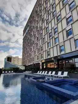 The hotel’s overall design revolves around the concept of "Open the Emotion," blending Okinawa’s tropical architectural culture into its facade. The heart-shaped sculpture at the entrance, designed by a German artist, is particularly eye-catching. The lobby features a clean and bright business style, with a butterfly crystal chandelier as the visual centerpiece. The overall color scheme is brown, and the facilities are relatively new. The lobby feels like an art gallery, with abstract paintings on the walls and uniquely designed furniture.
