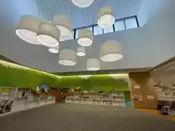 The bus station and Asahibashi Station are accessible via a connecting walkway. The library boasts a modern design and a large collection of books, creating a bookshop-like atmosphere. The library is brightly lit during the day and softly lit at night, creating a charming atmosphere.