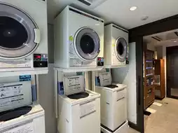 The hotel's first floor houses the reception desk and breakfast dining area. Outside on the first floor, there is a simple swimming pool, while the second floor features laundry machines, dryers, a gym, and an ice machine.