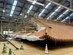 The temporary roof covering the main hall has apparently been removed, revealing its vibrant red exterior.