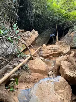 • The path up is almost vertical, requiring you to climb over rocks, using ropes, trees, and bamboo to pull yourself up.