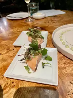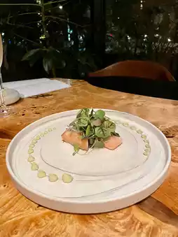 The salmon, likely cooked at a low temperature, was moist and perfectly paired with the sauce. ⸜🐟⸝