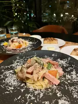 The pasta, with its delicious bacon, featured a variety of seasonal vegetables. It was filling and perfectly matched with the flat noodles ♡
