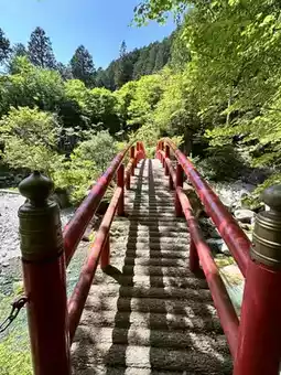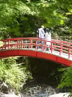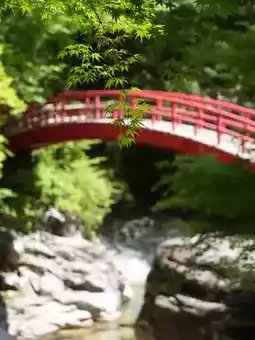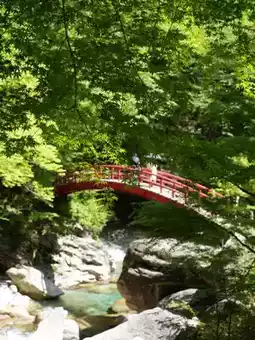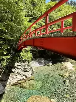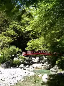 [Gifu] The fascinating contrast between green maples and a red bridge
