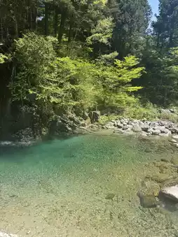 This river, as you can see, shines emerald green and is called "Ao-gawa" (Blue River). Its high transparency and stunning beauty truly cleanse the soul.