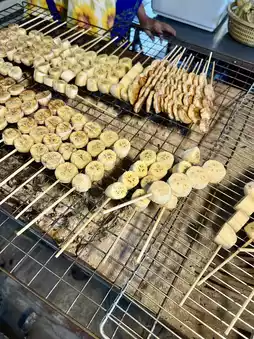 The food is also full. We started with grilled squid, which was very fresh and chewy. The seafood sauce was really spicy. We walked a little further and found a grilled banana shop. The aroma hit our noses. The coconut milk was just the right amount of sweet. Eating it made us feel like we had traveled back in time.