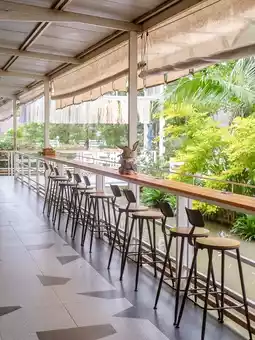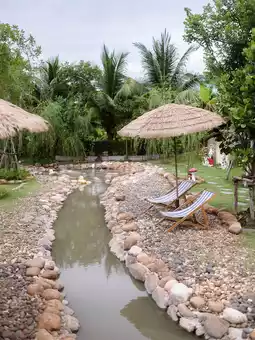 There are many seating areas, both air-conditioned rooms and huts by the canal