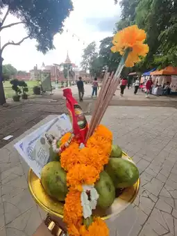 🙏 Point 2: Ganesha on Prasat Nakhon Luang. Worship sets are available for purchase. After you make your offering, you'll receive a bracelet and other requests you can take home for good fortune.
