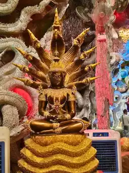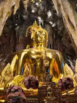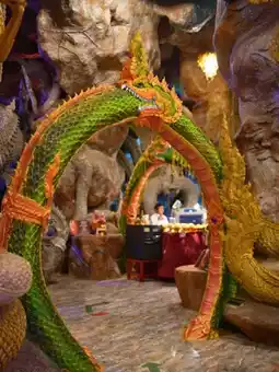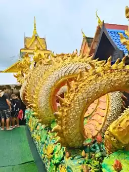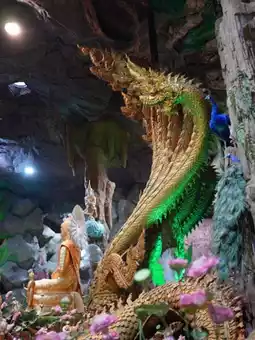 💞 Wat Mani Wong in Nakhon Nayok Province is a stunning temple, renowned for its dazzling golden Naga sculptures, a unique attraction that draws many tourists. The temple's highlight is the 100 Million Baht Ubosot (ordination hall), constructed entirely of marble. Inside, the principal Buddha image in the First Sermon posture and a large Naga statue are enshrined. The Naga Cave, also intricately decorated with carved stone and glittering lights, is a must-see for tourists.