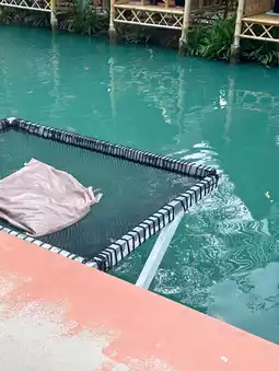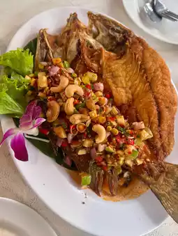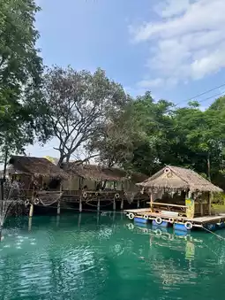 This place feels like dining in a shady garden. The cafe is cute, with colorful blue water and a fish feeding station.