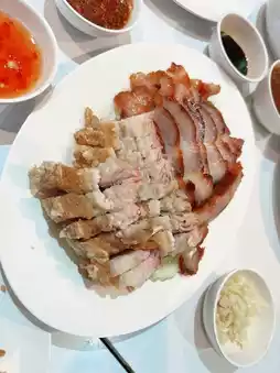 The second dish, boiled chicken rice, roasted chicken, and fried pork, is another combo worth trying! The boiled chicken is tender and maintains its delicious standard, while the roasted chicken offers a different flavor profile, with a slightly firmer texture and aroma, but still juicy. The fried pork is fried to a crispy outside and tender inside. The flavors are perfectly balanced and go well with the chicken rice. Overall, Auntie Ja's stands out for its generous portions, which are well worth the price. Plus, they offer free hot soup! 🥣 If you're looking for simple, delicious chicken rice at a reasonable price, and a great value, you definitely need to try this place. It's truly a place you can eat at any time of the day, and it's open 23 hours, so you won't go hungry! 👍✨