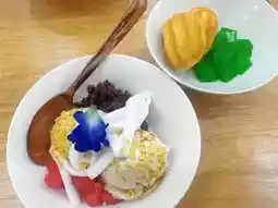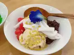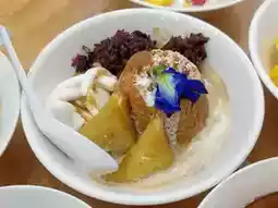 Yoi Yoi Cafe is a charming spot specializing in modernized Thai desserts and fusion-style shaved ice. The cafe is owned by a local chef from Nakhon Pathom who decided to return to their hometown to open this delightful establishment. The highlight of the cafe is its use of palm sugar as a key ingredient in many dishes, giving the desserts a unique aroma and a perfectly balanced sweetness. Each dessert is also beautifully presented, making them visually appealing.