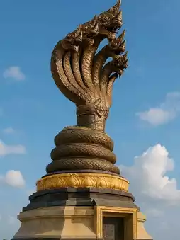 The seven-headed golden Naga on the Mekong River reflects the cool light beautifully, a gathering point for faith and a popular photo landmark.