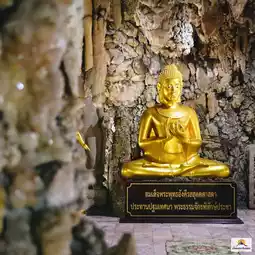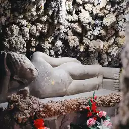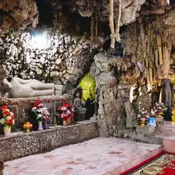 There is a cave with stalactites and stalagmites that were created. The stones used to make stalactites and stalagmites come from blasting mountain rocks to make cement. They were reassembled and modeled into a cave to serve as a memorial and for future generations to visit and study. Inside the cave, there is also an ancient Buddha statue.