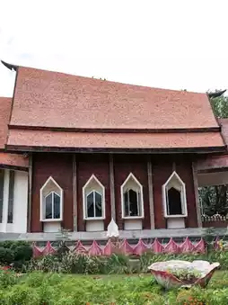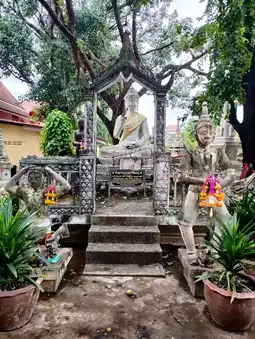 The Old Junk-Shaped Ubosot: The temple's most striking feature is the old Ubosot, built in the shape of a floating junk, decorated with unique terracotta tiles from Dan Kwian. The front wall depicts the life of the Buddha, while the back depicts the Buddha's descent from the Tavatimsa Heaven. Inside, a principal white stucco Buddha image in the Subduing the Ocean posture, known as "Phra Phutthapraphat Sunthon Thammaphisan." Sala Loi Phiman Worasantisukmunin. This ubosot (ordination hall) received an award for outstanding architecture in 1973.
