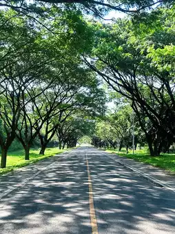 If you're visiting Korat and looking for a natural photo opportunity, this is the place to go: the Tree Tunnel at Suranaree University of Technology. Both sides of the road are lined with large rain trees, their dense canopies creating a shady atmosphere, perfect for taking photos with a natural feel. If you visit during February and March, you'll be able to take photos with the beautiful pink and white Cassia trees.