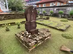 The Giant Chedi is the second-largest chedi after the Phra Borommathat Chedi. Its Sri Lankan style was renovated by the Fine Arts Department between 1975 and 1979. In front of the chedi is a viharn housing a large seated Buddha image. Locals call it Wat Phra Ngern.