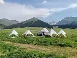 On the vast and boundless grassland, pink and white yurts are scattered, offering visitors a unique nomadic cultural experience for a fee. In the distance, snow-capped mountains stand majestically, forming a magnificent picture with the lush green grass and dense forests. Tourists rest under various tents, enjoying the tranquility and harmony of this place. Everything appears so natural and beautiful, invigorating the soul.
