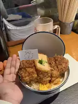 #TravelChat If you're planning a stroll around Namba and are a tonkatsu lover, you definitely shouldn't miss this place! 👉 Katsudon Chiyomatsu, a famous restaurant known for its enormous tonkatsu pieces, often attracting queues for hours. We visited on a weekday and still had to wait a full hour, but it was definitely worth the wait! ✨