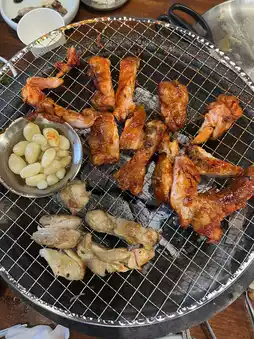 🌳 At Hunmak, we ordered Dakgalbi (grilled chicken) in both salted and marinated styles, cooked over charcoal in a clay pot. The meal was delicious, and after enjoying it, we took a walk along the Bukhan River before heading to a cafe for some tea.