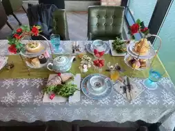 "This is not a luxurious hotel, but a simple place, so you might be disappointed," he said, but from the moment you enter, elegant teacups, trays, and plates show off their elegance on the left.