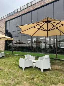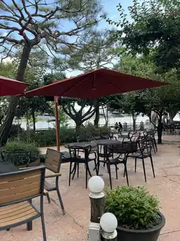 The expansive green grass bathed in soft sunlight creates a picturesque scene, almost like a painting. Scattered throughout the garden are quaint tables and chairs, offering a delightful spot to relax and enjoy the gentle riverside breeze. 🌳