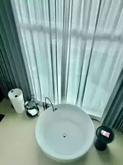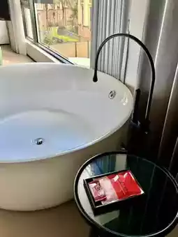 2️⃣ Clean, upscale rooms equipped with fridge, bathrobes, TV, bathtub—fully stocked and well-lit!