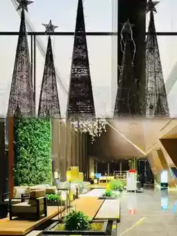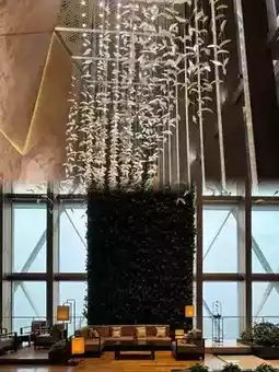 2. The interior design is of HBA Hong Kong Office, which adopts neo-Chinese aesthetic design, using elements such as green plants and leaf-shaped glass, and using geometric cutting and bird-shaped chandeliers to transform the nearly 4-story lobby space into a sky garden.