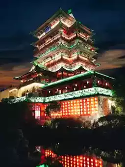 The tower with bright lights in the photo is one of the most shocking pictures I have taken at night. Baoyu Tower becomes extremely spectacular under the lights at night, with layers of blue and orange light, like a ladder to heaven. That night, I specially put on Hanfu, held a lantern, and stood in front of the tower for a photo. I felt like I had traveled to ancient times, and the atmosphere was dreamy and romantic. There were many tourists coming and going in front of the tower, but everyone was very polite and gave each other space to take pictures. Many people also wore traditional costumes, and the whole atmosphere was very cultural.