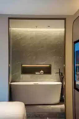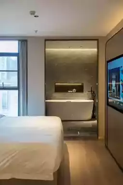The hotel blends Eastern elements into its cozy, smart-room design, featuring intelligent toilets—a perfect mix of Chinese aesthetics and tech for a comfy stay.