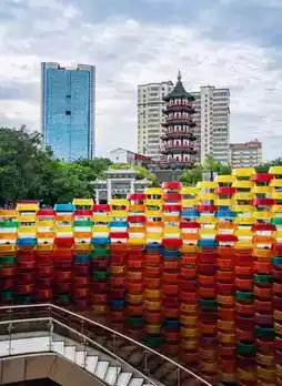 From Exit 3 of Shengjin Pagoda subway station, walk forward to shoot the colorful acrylic wall with the pagoda.