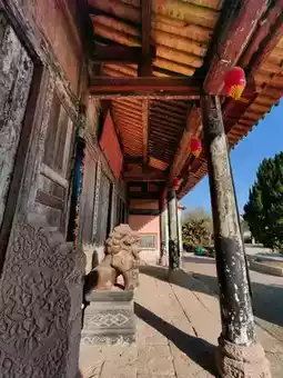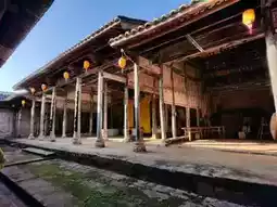 The ancestral hall faces south and sits north, with the Canglang River in front and Maopeng Mountain behind. It measures 35m wide and 53m deep, covering an area of 1,600 square meters. The complex features three halls and two courtyards, with seven rooms across its width, and a hard-top roof built in brick and wood structure. The main entrance has three parallel doors with a hard-top, double-slope roof in an outward-spreading design. A pair of stone lions stands beside the middle gate. Each side gate features a pair of drum-embracing stones carved with flowers representing the four seasons - spring, summer, fall, and winter. The front courtyard measures 14m in length and width. On both east and west sides of the courtyard are corridors supported by 4 stone pillars and 3 moon beams. The middle hall features a beam-lifting wooden structure in the center, with four-room-wide through-tenon wooden structures on both east and west sides. The upper hall serves as the Hu family temple, housing ancestral tablets of past generations, and shares the same structural design as the middle hall, with a beam-lifting wooden structure in the center and three-room-wide through-tenon wooden structures on both sides. Corridors connect the middle hall and the courtyard.