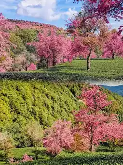 In Wuliang Mountain, more than 2,000 acres of tea gardens are full of cherry blossoms