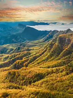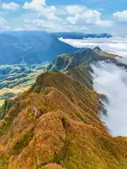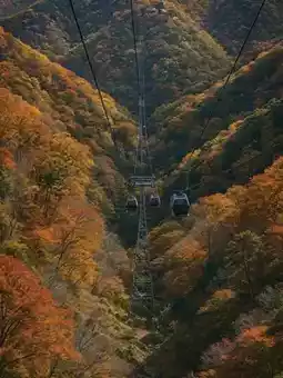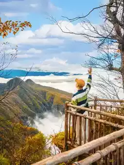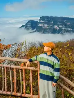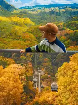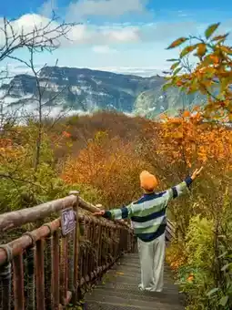 There really is a place that can splash the green and ochre of the "A Thousand Li of Rivers and Mountains" painting into mountains covered with autumn colors—from the bright red leaves drifting in the streams of Heixiong Valley to the golden sunlight hanging between the branches of the Natural Gallery. Just a cable car ride high, it feels like falling from one palette into another colorful dream.