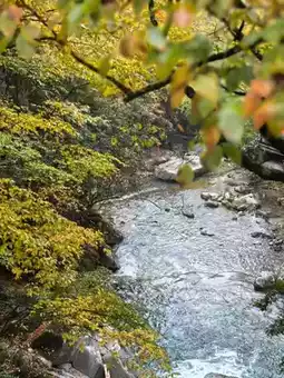 The rushing creek paired with autumn leaves creates an immersive atmosphere 🍂