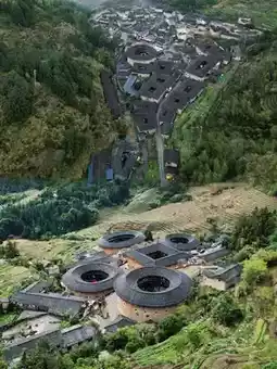 Explore more than 50 tulou and small blue brick buildings scattered in the valley, enjoy the natural beauty like a paradise, and admire the ancient ancestral hall architecture and the rare stone dragon flagpole.