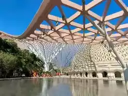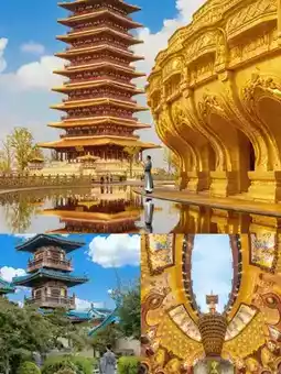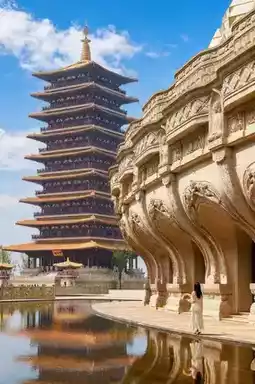 The exterior of the Niushoushan Cultural Tourism Area is quite artistically designed. The palace roof is composed of three-dimensional ridges, resembling the Buddha's top relic. The adjacent hollow grid canopy looks like an open treasure umbrella, providing shelter for the Buddha, full of artistic conception and design sense.