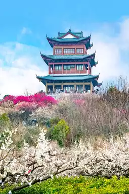 Despite being called a "mountain," it's not very high. You can easily reach the summit of Plum Blossom Mountain in about 20 minutes on foot. From the pavilion at the top, you can enjoy a panoramic view of the entire mountain covered in plum blossoms. The vast sea of flowers is truly breathtaking❗ The surrounding buildings with white walls and black tiles complement the scenery perfectly.