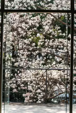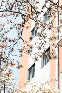 The combination of blue sky, magnolia and retro architecture creates a full atmosphere