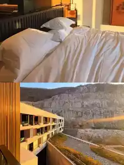 Rooms feature floor-to-ceiling windows with views of the lake and traditional white-walled, black-tiled houses. The beds are twice as wide as dorm beds, and the bathroom has a separate wet area with a rainforest shower mode—washing your hair feels like standing under a waterfall, so refreshing!