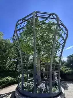 A nine-story pagoda where visitors ascend on foot, circling clockwise in worship. The steps below the pagoda are lined with numerous ginkgo trees, while the only two bodhi trees are enclosed in iron railings to protect these warmth-loving plants.