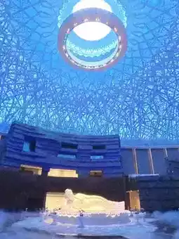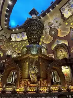 The Grand Buddha Palace (佛顶宫): Enter a 360° sunken palace resembling a cosmic lotus floating on a lake. Beneath its titanium dome lies a staggering 9-story underground palace, adorned with vaulted corridors, 10,000 Buddha niches, and a 21.8-meter reclining Buddha bathed in celestial light.
